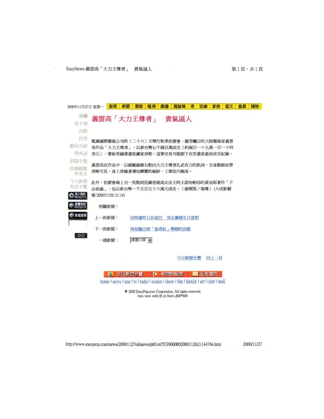 甄藏國際藝術公司昨 (二十六) 天舉行秋季拍賣會,備受矚目的大陸藝術家義雲高作品「大力王尊者」,以新台幣七千兩百萬成交 (約兩百一十九萬一百一十四美元),賣給英國書畫收藏家奈勒,這筆交易可能創下在世畫家最高成交紀錄。